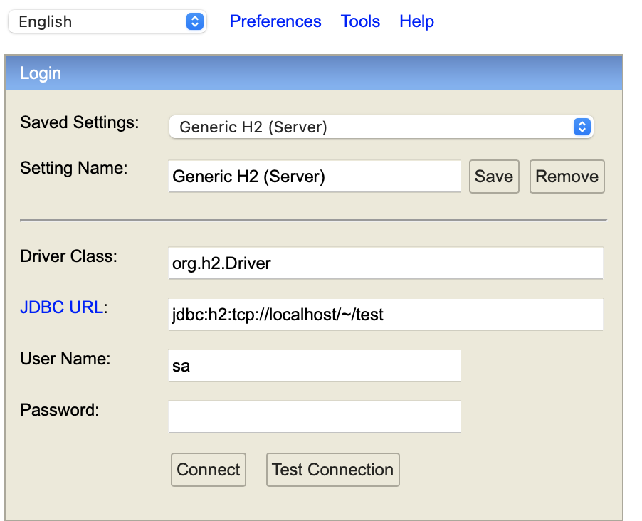 만약 아래 와 같은 이미지의 에러 문구가 뜬다면, JDBC URL : jdbc:h2:~/test 로 작성 후에 접속하자