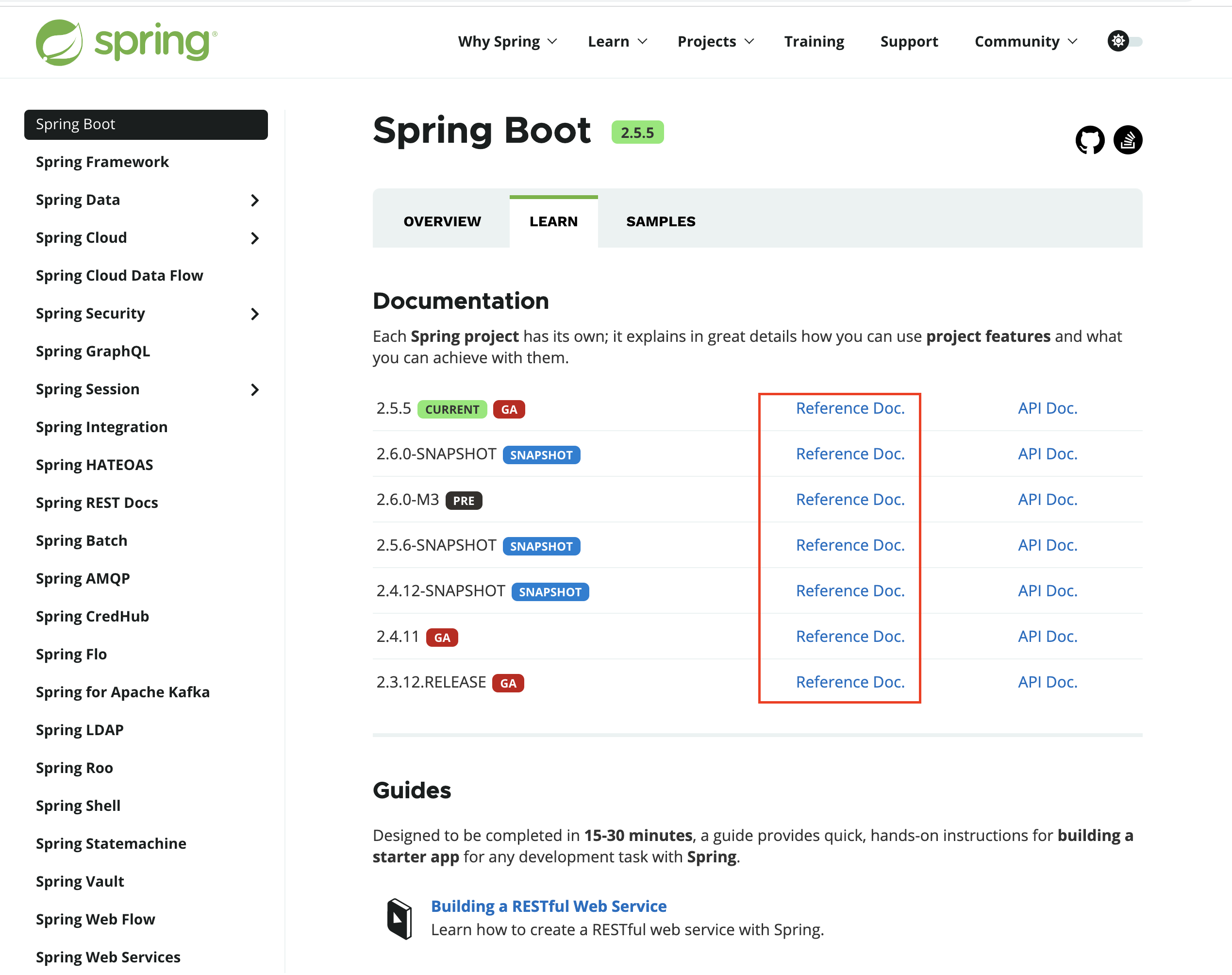 3. 하위 탭에서 LEARN 클릭 후에 원하는 버전의 Reference Doc 클릭