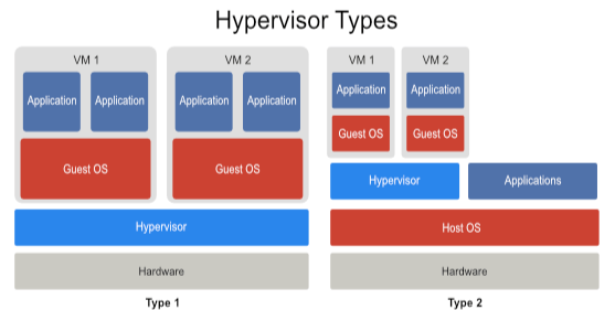 - Hypervisor (하이퍼바이저) : 가상머신(독립된 컴퓨터)의 리소스 관리 및 서로 독립적인 환경을 제공하기 위한 가상머신 간의 리소스 접근 방지 등을 제공하는 소프트웨어